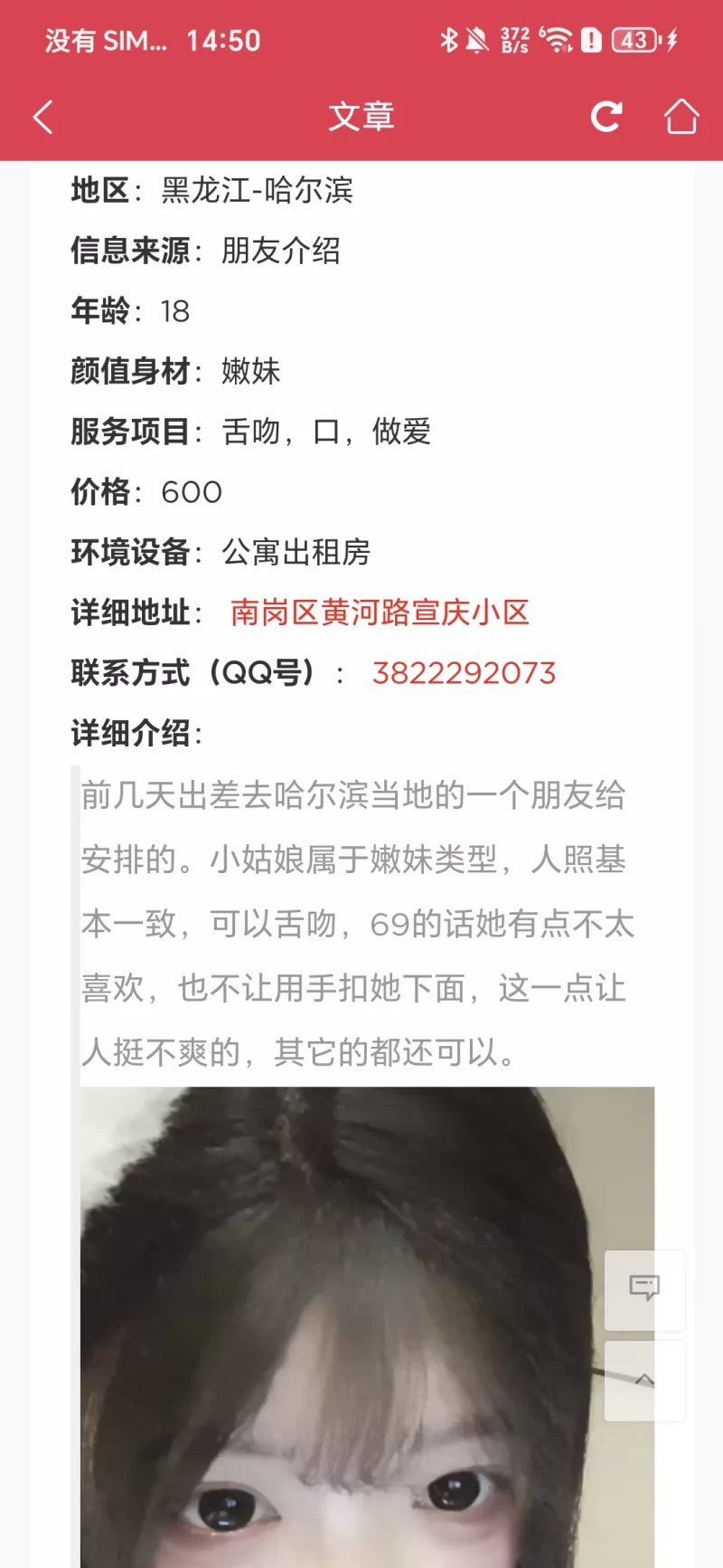 信息分类:骗子曝光 地区:黑龙江-哈尔滨 信息来源:论坛 年龄:18 颜值身材:无 服务项目:无 价格:无 环境设备:无 详细地址: (管理提示:经用户举报,此信息有诈骗行为,请勿被骗!) 联系方式(QQ号): (管理提示:经用户举报,此信息有诈骗行为,请勿被骗!) 详细介绍: 给完定金没话了 骗子曝光
